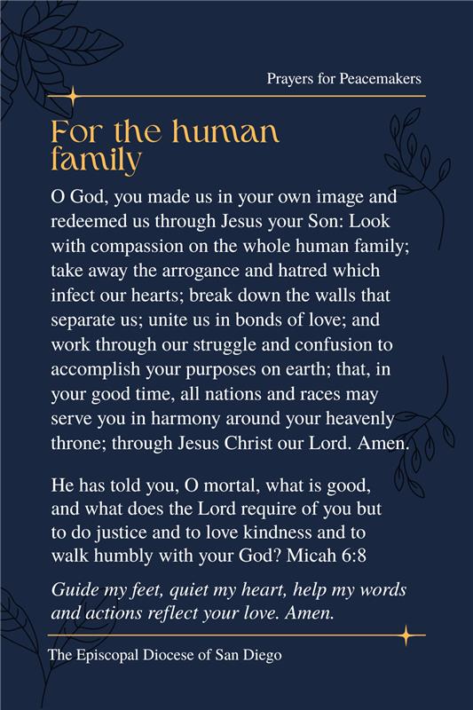 Prayerful Presence— Advocacy rooted in prayer and Scripture begins not with anger, but with a desire to align our hearts with God’s will. This prayer card (PDF printable template here) is an offering to help you root yourself in God’s call to care for all people. You can find additional prayers and scripture resources here. As you prepare for any courageous act of love, we encourage you to begin and end with prayer, and to allow God’s word to guide you in this important work. If you have questions, please email EDSD Director of Formation, Charlette Preslar, at cpreslar@edsd.org.