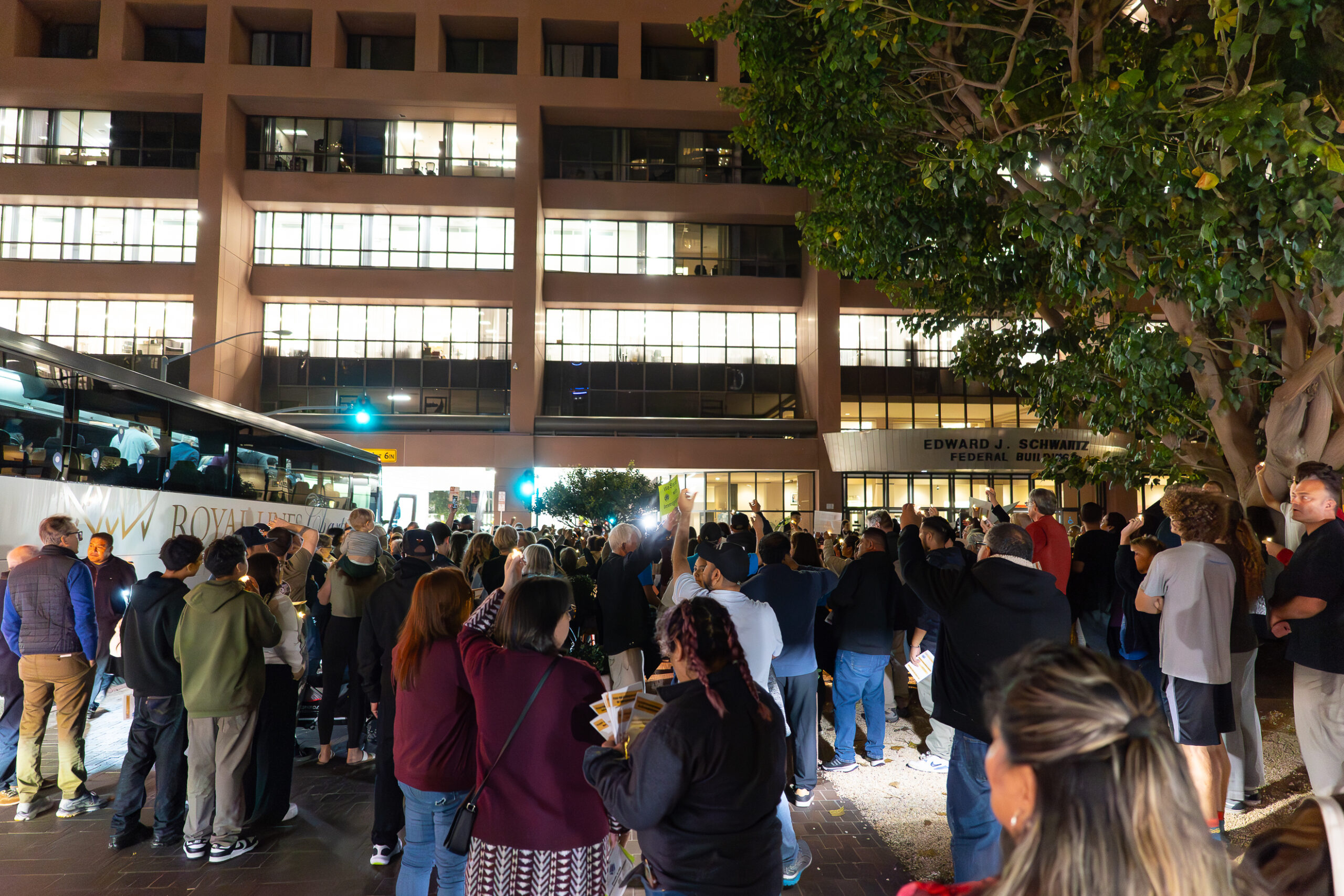 On Thursday, November 13, just after sunset, hundreds gathered outside the Edward J. Schwartz Federal Building. Clergy in collars, families with children, young and old holding candles, longtime advocates, and neighbors passing by–all drawn to an urgent purpose. They did not come for a political demonstration. They came to pray.