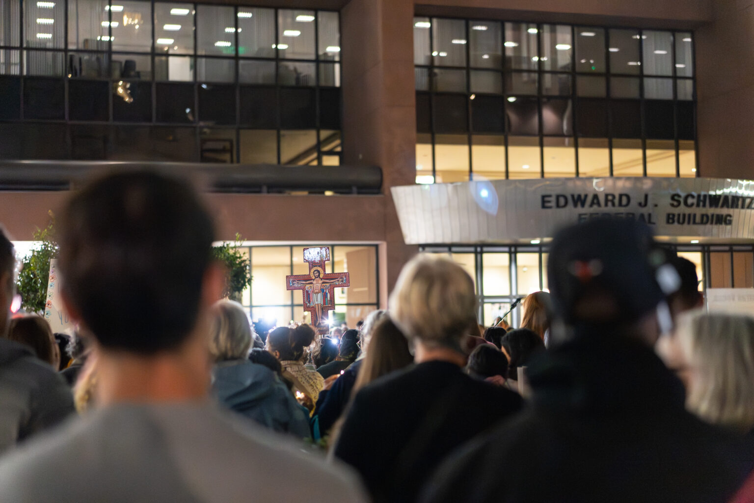 On Thursday, November 13, just after sunset, hundreds gathered outside the Edward J. Schwartz Federal Building. Clergy in collars, families with children, young and old holding candles, longtime advocates, and neighbors passing by–all drawn to an urgent purpose. They did not come for a political demonstration. They came to pray.