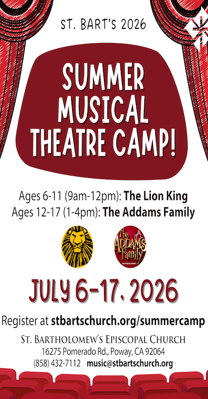 It is precisely this conviction that shapes St. Bart’s 2026 Summer Camp, a two-week Musical Theatre Camp taking place July 6–17, 2026, at St. Bartholomew’s Episcopal Church, Poway (info at stbartschurch.org/summercamp). While the camp culminates in a celebratory showcase of selections from a beloved musical, its deeper purpose is formation: cultivating confidence, creativity, empathy, discipline, and joy within the life of the Church.
